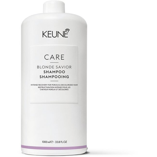Keune Care Blonde Savior Shampoo 1000 ml, jouw ultieme bondgenoot voor het verzorgen van blond, grijs en wit haar. Deze geavanceerde shampoo is speciaal ontwikkeld om ontkleurd en beschadigd haar te herstellen, terwijl het je lokken helder en makkelijk doorkambaar maakt.